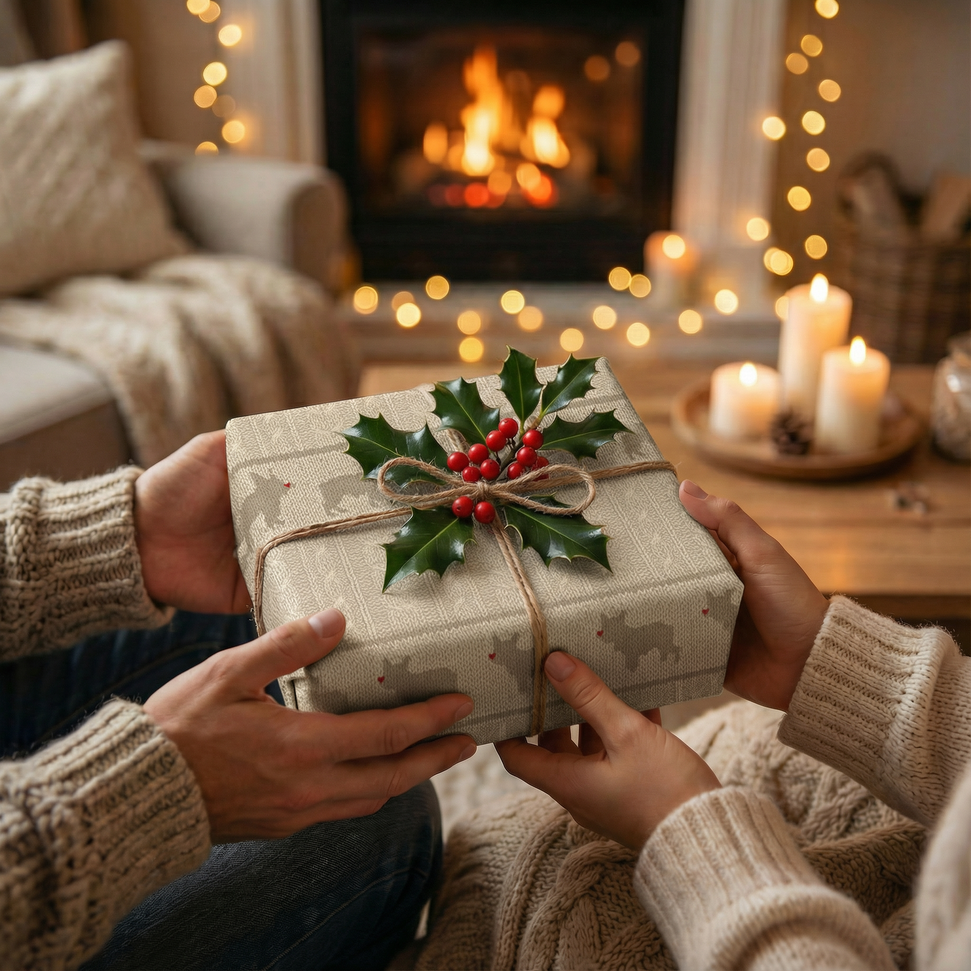 Soft, neutral kraft paper printed with a rustic French Bulldog and understated Scandinavian knit motifs. The muted palette and textured look bring a quiet, cozy mood to holiday and everyday gifts. It wraps slow mornings and bundled-up walks—the kind of paper that